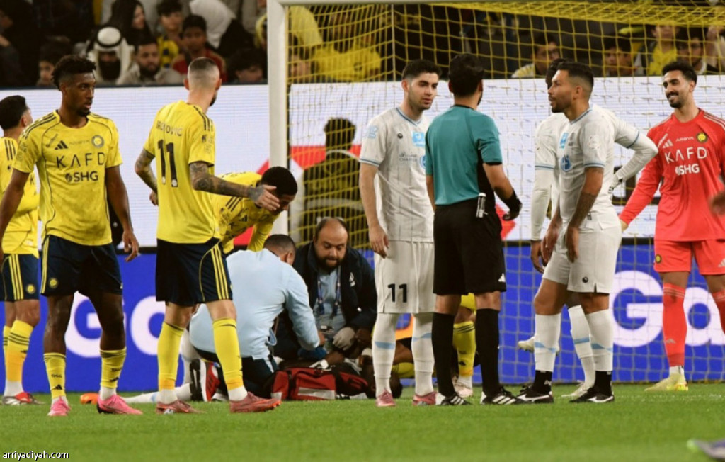 خالد ناري، لاعب فريق الأخدود، يتلقى العلاج على أرضية الملعب، بعد اشتراك على كرة مع نواف العقيدي، حارس مرمى النصر، ضمن دوري روشن السعودي لكرة القدم. (أرشيفية)